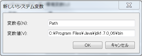 新しいシステム変数のダイアログで,変数名を「Path」に,変数値を「(JDKのインストールディレクトリ)\bin」として追加する