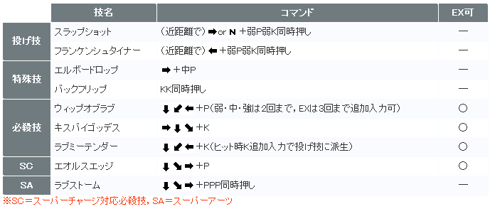 (画面端)ジャンプ強P>屈強P>強エオルスエッジ>屈弱P>屈中K>ウィップオブラブ×3:ダメージ367